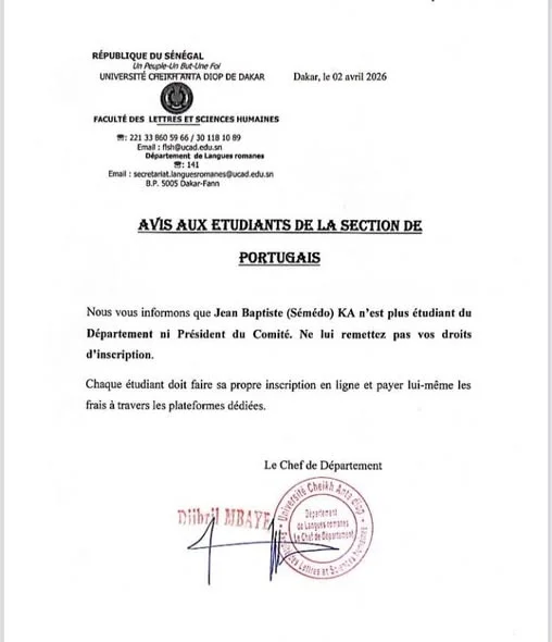 Le Chef du Département de Langues romanes de la Faculté des Lettres et Sciences Humaines (FLSH) de l'Université Cheikh Anta Diop de Dakar a publié un communiqué urgent ce 02 avril 2026 concernant les modalités d'inscription.