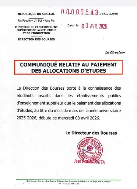 Le paiement des bourses au titre du mois de mars de l'année universitaire 2025-2026 débutera officiellement ce mercredi 08 avril 2026.