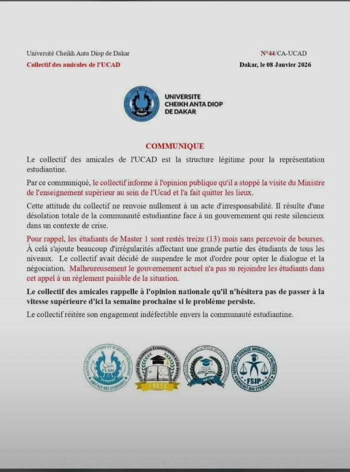 Le Collectif des amicales de l'Université Cheikh Anta Diop de Dakar (UCAD), organe de représentation des étudiants, a publié un communiqué ce 08 janvier 2026 pour dénoncer la situation de crise qui prévaut au sein de l'institution. Cette déclaration fait suite à un incident majeur au cours duquel la visite du Ministre de l'Enseignement supérieur a été interrompue par les étudiants.