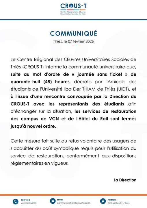 La Direction du Centre Régional des Œuvres Universitaires Sociales de Thiès (CROUS-T) a annoncé, ce samedi 07 février 2026, la fermeture jusqu'à nouvel ordre des restaurants des campus VCN et de l'Hôtel du Rail.