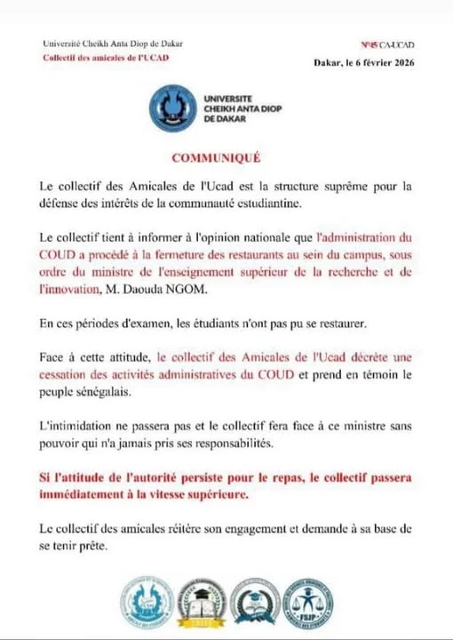 Source : Communiqué du Collectif des Amicales de l'UCAD du 06 février 2026.
