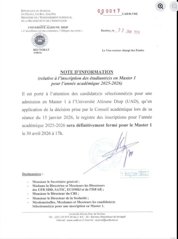 Par une note d'information datée du 22 janvier 2026, le Recteur de l'Université Alioune Diop (UADB), le Pr. Senghane MBODJI, a communiqué les modalités de clôture des inscriptions pour l'année académique 2025-2026.